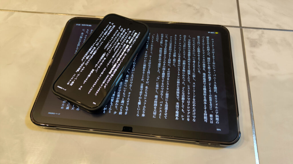 ということで私はiPhone 16とiPad無印 第11世代にアンチグレアフィルムを貼ってダークモードで読むことにしている。アンチグレアフィルムを貼ってないと今度は映り込みが気になるからだ。